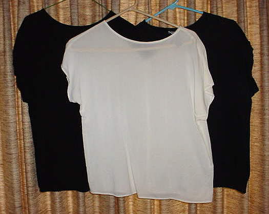 2 MELROSE OPTION DRESS TOPS IN BLACK AND WHITE AND ONE BLACK COTTON PATTERENED SWEATER