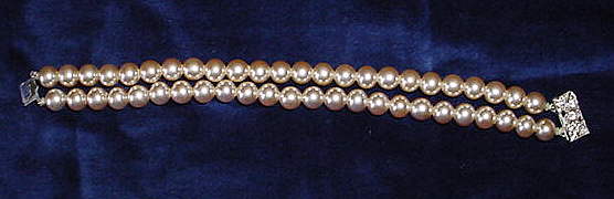 VINTAGE FAUX PEARL DOUBLE STRAND PEARL BRACELET WITH RINESTONE CLASP