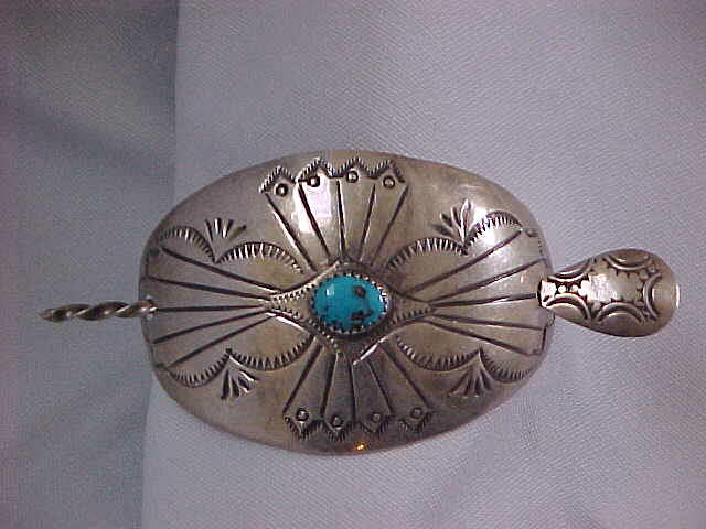 CLASSIC NATIVE AMERICAN hand crafted sterling silver and turquoise bun clip. This is probably Navajo or Zuni. We think this unusual piece resembles the classic Native American tortoise design. It is 10 years old and was acquired in Sedona, AZ. Beautiful, rare and unique! FREE SHIPPING, HANDLING AND INSURANCE.