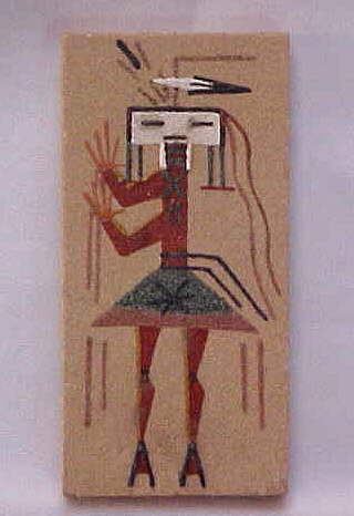 CLASSIC NATIVE AMERICAN artwork. This great painting is probably Navajo or Zuni from Northern Arizona. This sand painting is titled "Coyote Girl" and has it's story written on the back. It is signed "teri" and is 3" by 6". It is 25 or more years old. Beautiful, rare and unique!