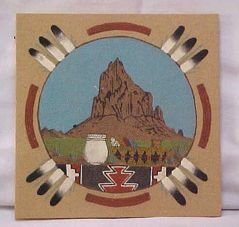 CLASSIC NATIVE AMERICAN artwork. This beautifully detailed sand painting artwork is titled "Shiprock". It is 12" by 12" and is 25 or more years old. It is signed "K Dixon" with his PO Box. Beautiful, rare and unique!