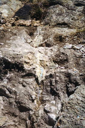 | Tucson Blue Precious Opal was formed by ancient volcanos and is part of the silicone rock that fills the mountainsides here. If you study this photo closely you can see the ribbon of blue running down the middle of the rock. It almost looks like water trickling down. This is very hard stone. Much of it is an unmistakable, vivid blue with all the firey colors you expect from opals. Reds, greens, blues and rainbow colors flash through these stones. You will also find variations in the colors of the stones that range from pale blue to what is considered "black opal" or a very deep blue. | ![]() |