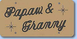 | You can order a Personalized Metal License Plate FRAME to say anything that you want. You can have appx. 20 characters on the top line and 30 on the bottom line. Spaces between words count as characters. FRAMES are available in both bright chrome or matt black. They are very durable and will last for years. Please specify if you want the FRAME inverted in order for the holes to be on the bottom of the FRAME. SCROLL DOWN TO PLACE YOUR ORDER | Model F1![]() COLOR CHOICES: Black with White, Red, Silver or Gold letters Blue - White letters Green - White letters Burgandy - White letters Gold - Black letters Ivory - Brown letters Navy - White letters |