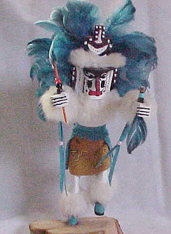 CLASSIC NATIVE AMERICAN hand crafted artwork. This great Kachina is probably Navajo or Zuni. This turquoise feathered Kachina is signed "Hemis" and was created in 1998. It is 15 & l/2" tall. While this lovely Kachina is not old, it is certainly the best quality modern Kachina. Exquisite!