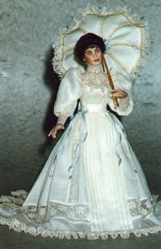 look in white accented with lace and ribbons. Her beautiful parasol is