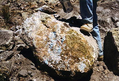 | Tucson Blue Precious Opal was formed by ancient volcanos and is part of the silicone rock that fills the mountainsides here. If you study this photo closely you can see the ribbon of blue running down the middle of the rock. It almost looks like water trickling down. This is very hard stone. Much of it is an unmistakable, vivid blue with all the firey colors you expect from opals. Reds, greens, blues and rainbow colors flash through these stones. You will also find variations in the colors of the stones that range from pale blue to what is considered "black opal" or a very deep blue. | ![]() |